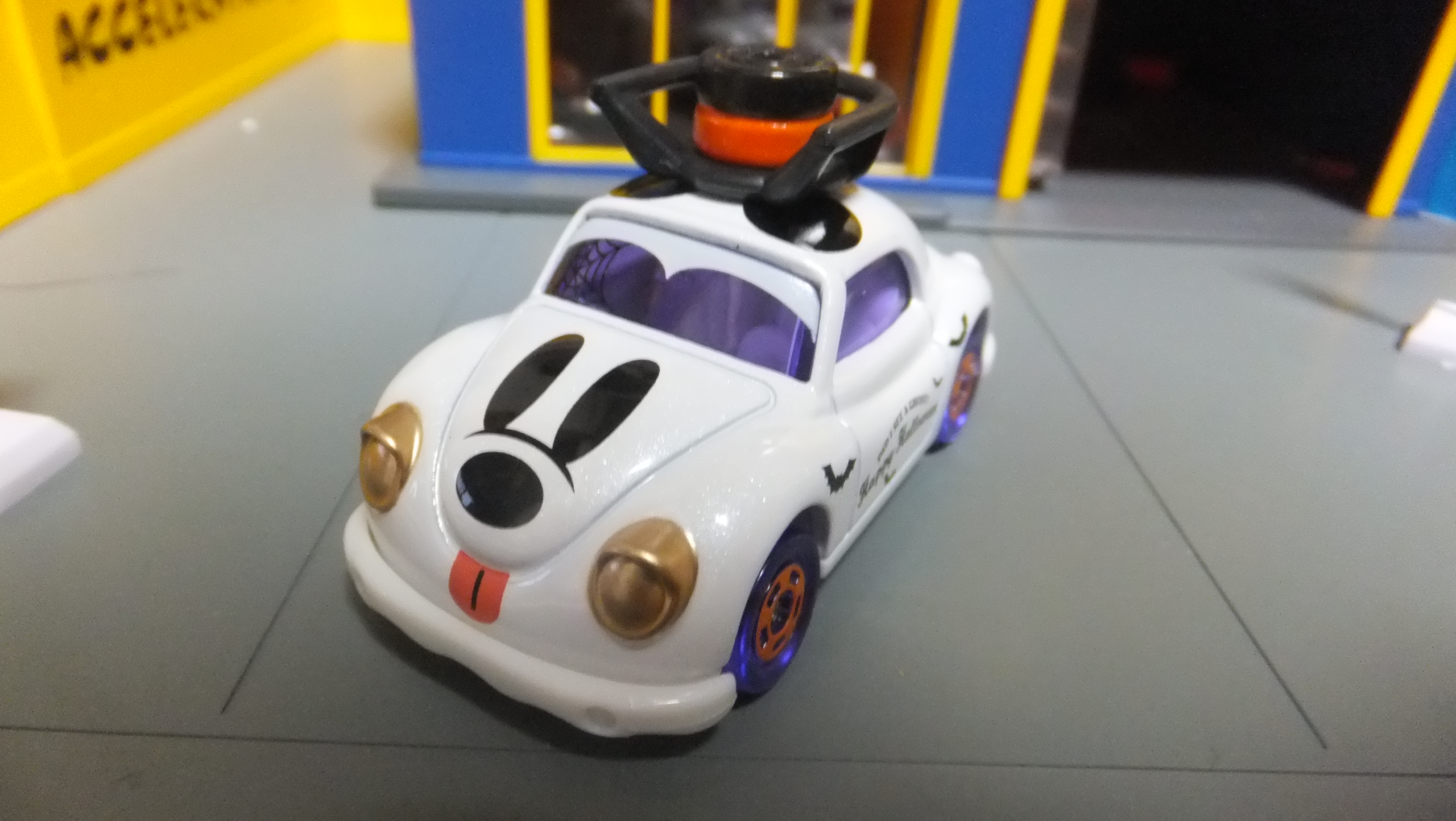クリアバイオレットのホイールと窓がハロウィンらしい怪しげな雰囲気も醸し出しています。屋根には帽子を象ったオブジェのようなものが乗っかっています。